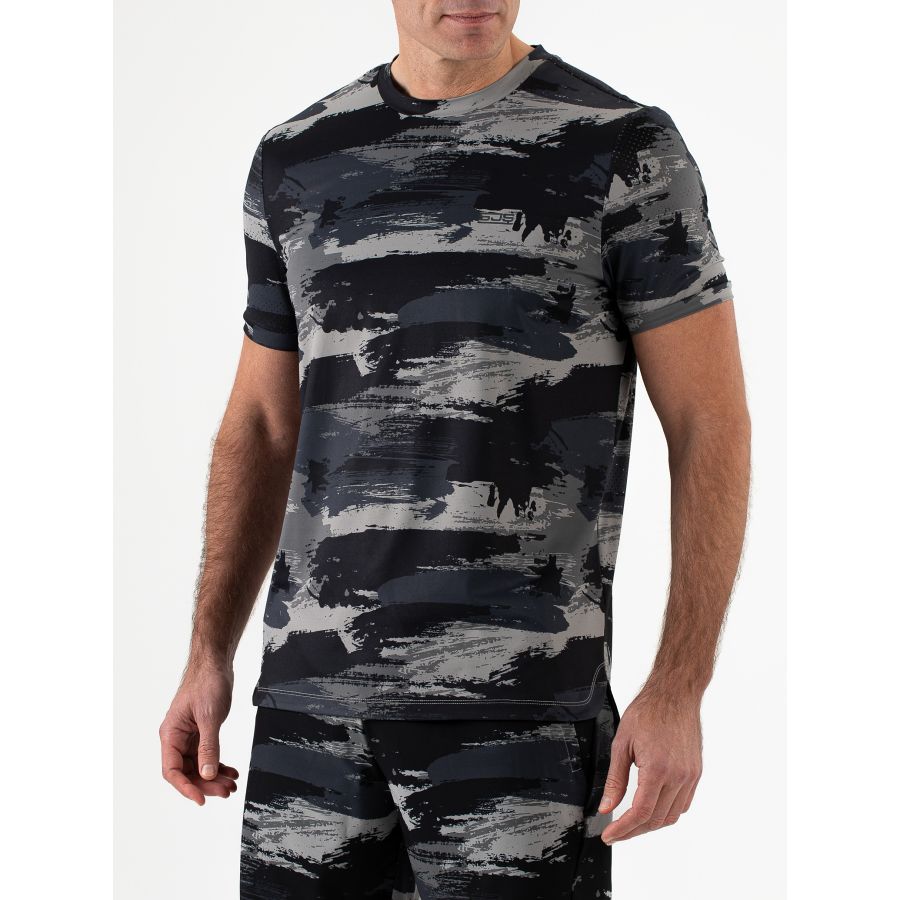 Dit zwarte heren t-shirt van soepele single jersey heeft een all-over print. Het