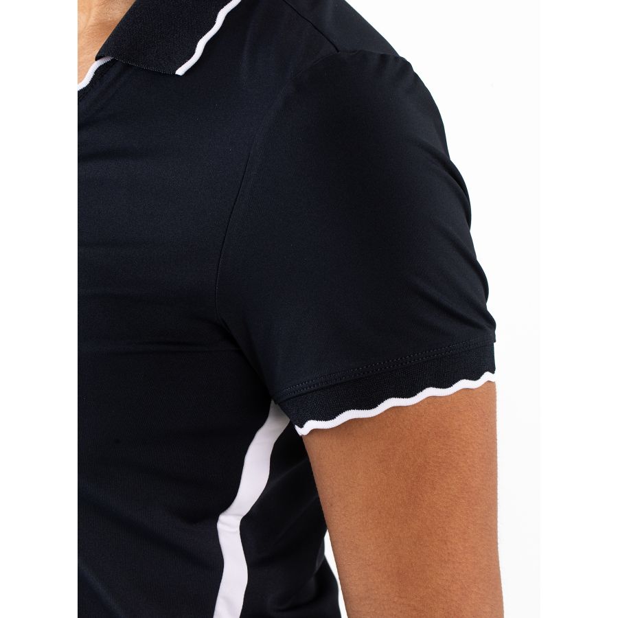 Stijlvolle dames polo die je zeker niet alleen tijdens het sporten zult dragen. Dit poloshirt van single jersey valt op door de geschulpte randen langs de halsopening en mouwboorden. Langs de zijnaden zitten contrasterende inzetten die dit shirt een mooie belijning geven.